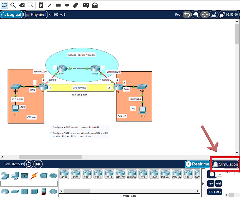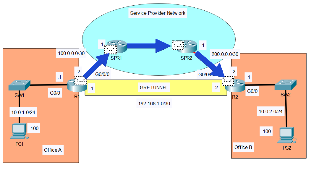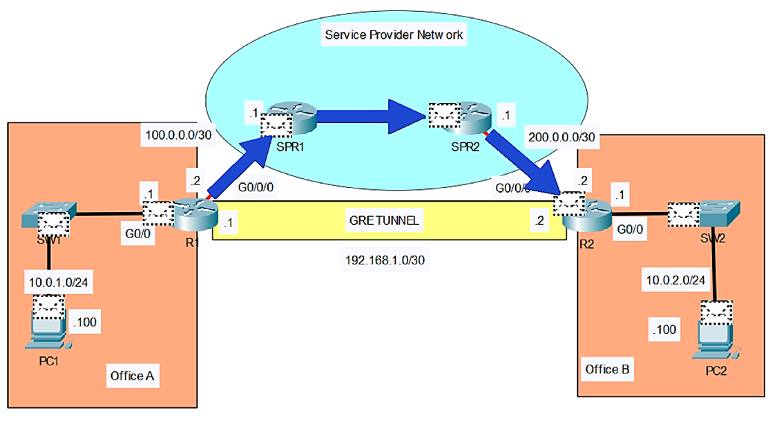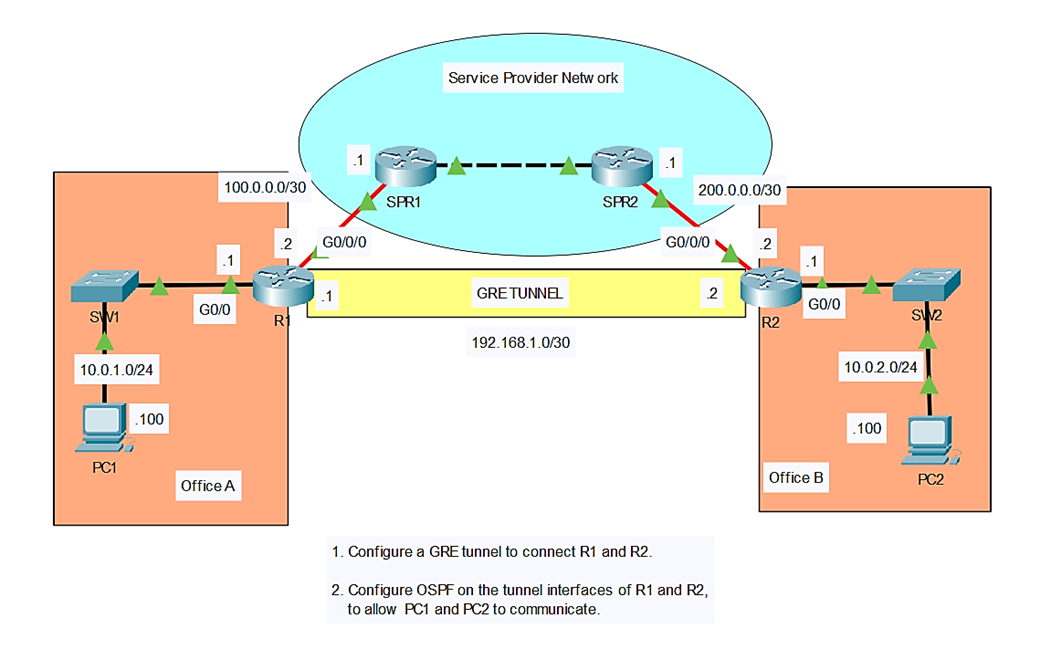 In this lab, I’ll show you how to configure a GRE tunnel between two routers. Then we will configure OSPF on the tunnel interfaces of R1 and R2, to allow PC1 in Office A to communicate with PC2 in Office B. You can follow along by downloading this GRE Tunnels Packet Tracer File and opening it in Cisco’s Free Packet Tracer Simulator (create a free account, enroll in one of the free courses and download the free software).