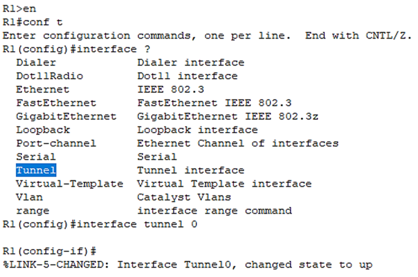 To configure a GRE tunnel, we have to make a tunnel interface. This is not a physical interface of course, but a virtual interface, like a loopback interface: