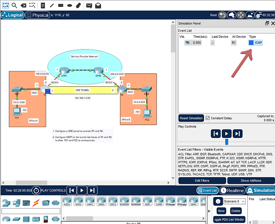 Let’s first look at a ping from R1 to R2 over the GRE tunnel in Simulation mode: