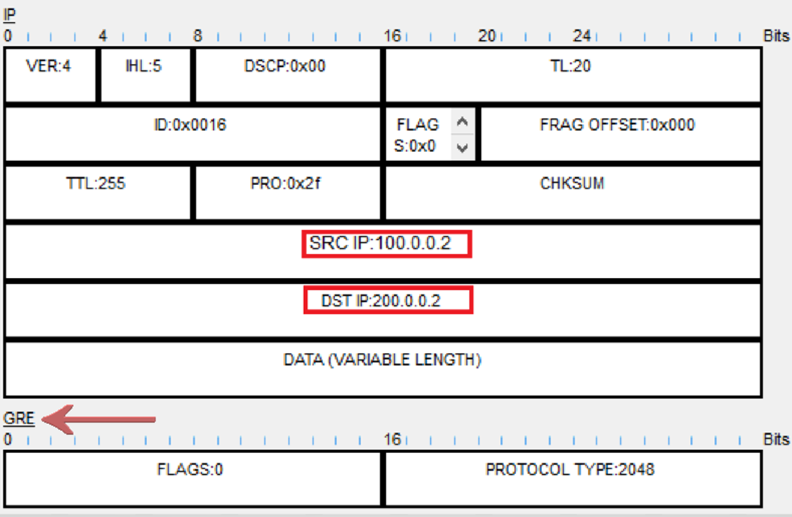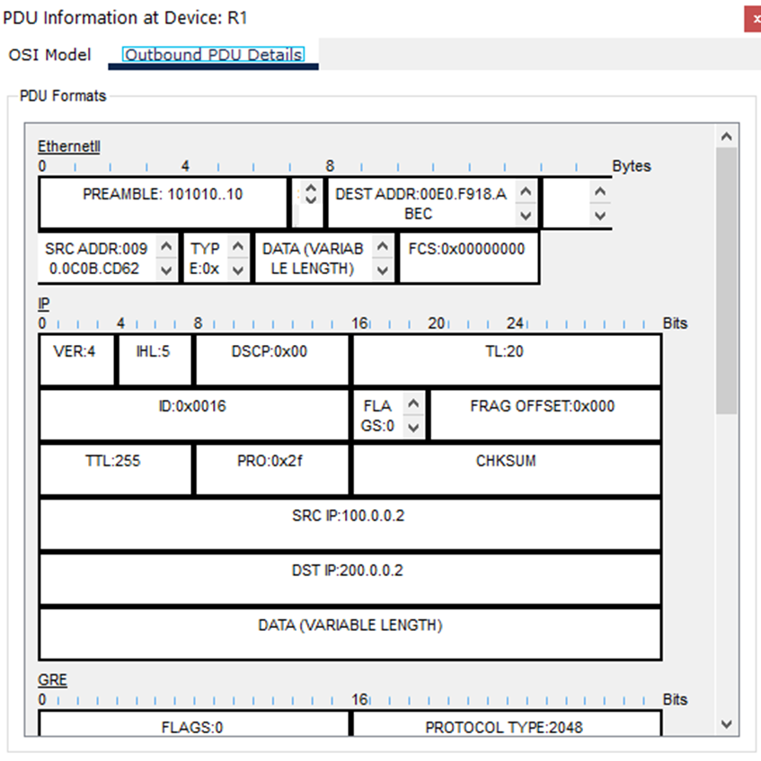 But still even on top of that, there is a GRE header, and on top of that, there is another IP header. In this outer IP header, the source IP is 100.0.0.2 (R1’s g0/0/0 interface), and the destination IP is 200.0.0.2 (R2’s g0/0/0 interface):