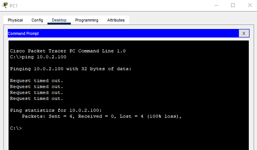 As you can see the ping’s timed out and didn’t work. But when R1 and R2 become OSPF neighbors, they will learn each other’s routes, and PC1 and PC2 will be able to communicate over the GRE tunnel.