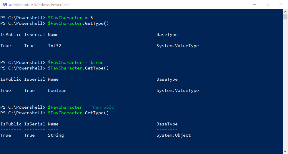 And if you type your variable $FavCharacter and press enter, you’ll see the string Han Solo printed to the screen: